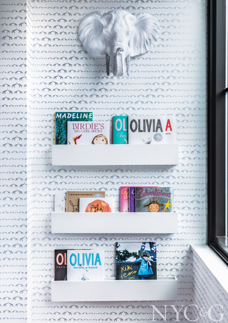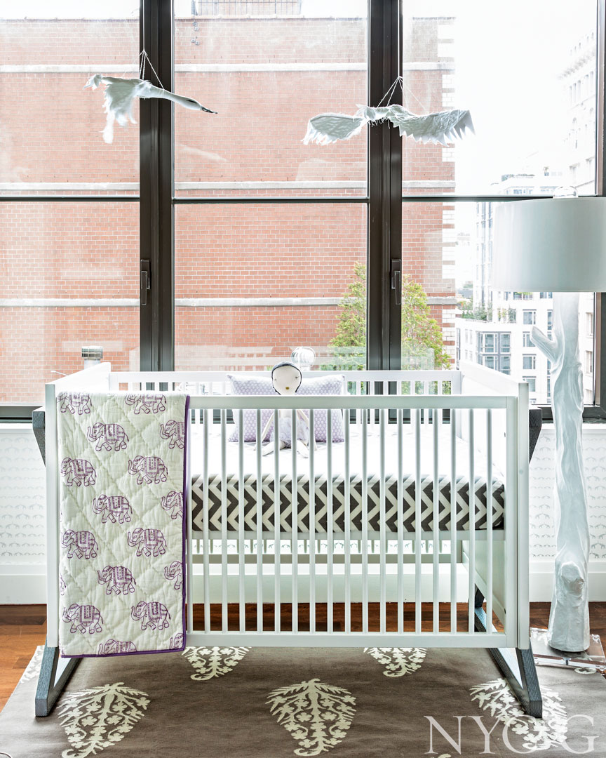 “A lot of people are attracted to our children’s work, which often leads to our redesigning other rooms too,” Geisler says. “Many families don’t necessarily want fancy spaces, but they still want something beautiful.” Sara and Douglas Mercer, whose 2,000-square-foot Tribeca apartment is featured on these pages, are a case in point. They contacted Sissy+Marley to design their nursery while Sara was pregnant with their daughter Hermione, who is now three (the couple are awaiting the birth of Hermione’s new baby sister this month). “I wanted to do something with baby elephants and found Sissy+Marley’s baby-elephant wallpaper online,” Sara recalls. “I fell in love with it.” Reale, Geisler, and Rice gave the nursery—formerly Sara’s office—a monochromatic palette of white, oatmeal, flax, and linen infused with metallics and pale pinks. “They made great use of the space,” Sara adds. “And the little touches, like the swans hanging above Hermione’s crib, make the room even more special.”