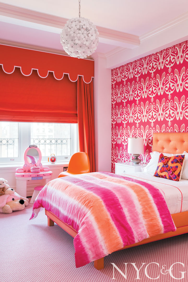 Another daughter’s room includes PBteen bedding and Quadrille fabrics on the bed frame and wall. The Murano glass light fixture is from John Salibello.