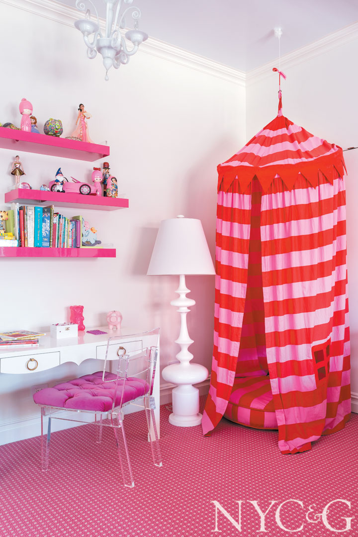 In a daughter’s room, a Plexi-Craft chair sits at a Bungalow 5 desk; the carpet is Stark.