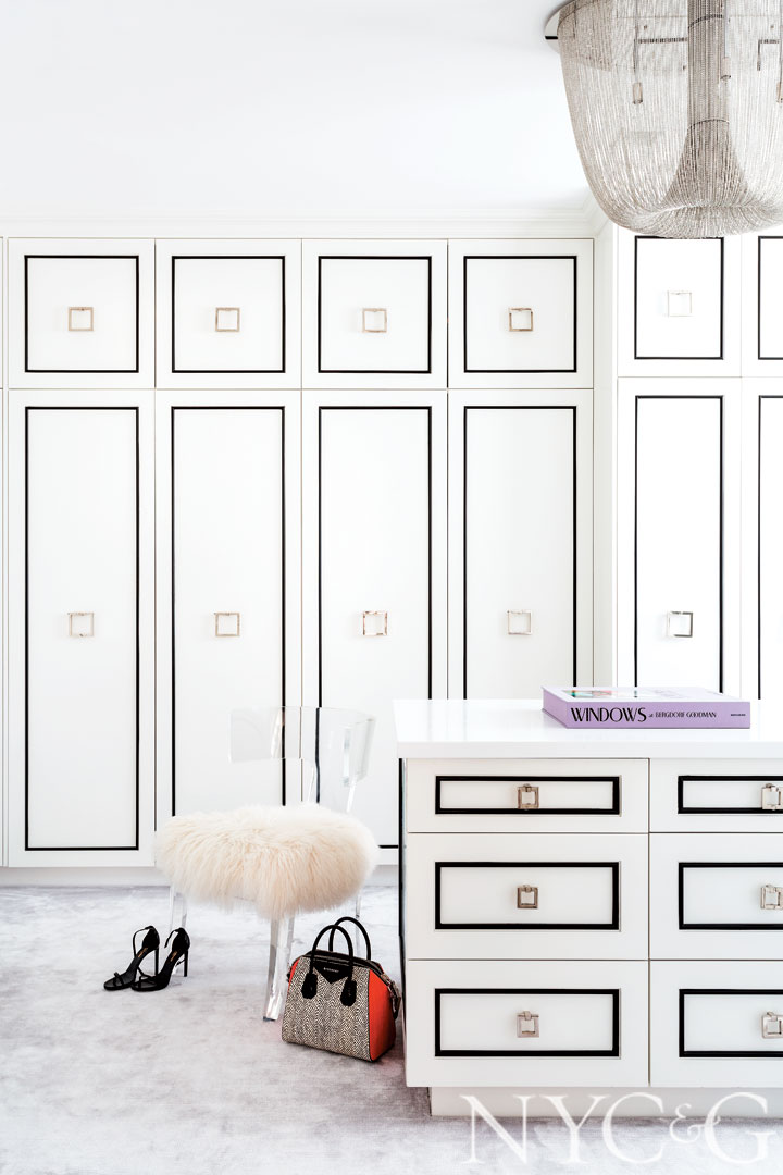 The Eric Cohler-designed cabinetry in the adjacent dressing room is painted Benjamin Moore’s White Diamond, with pulls from The Brass Center. The rug is Stark and the acrylic chair is from Andrew Martin.
