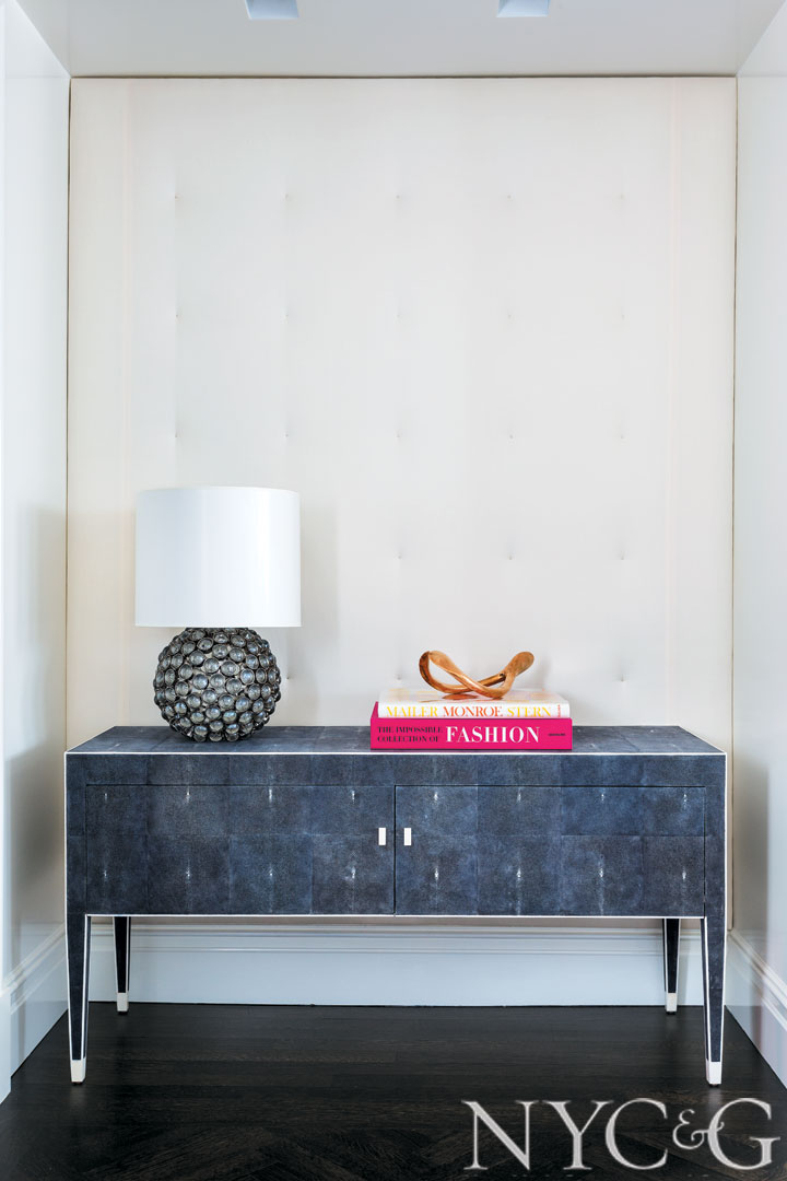 A living room nook features a tufted wall covering in Holland & Sherry Andes in Vanilla. An Anemone lamp from Best & Lloyd sits atop an onyx and shagreen John Lyle cabinet.