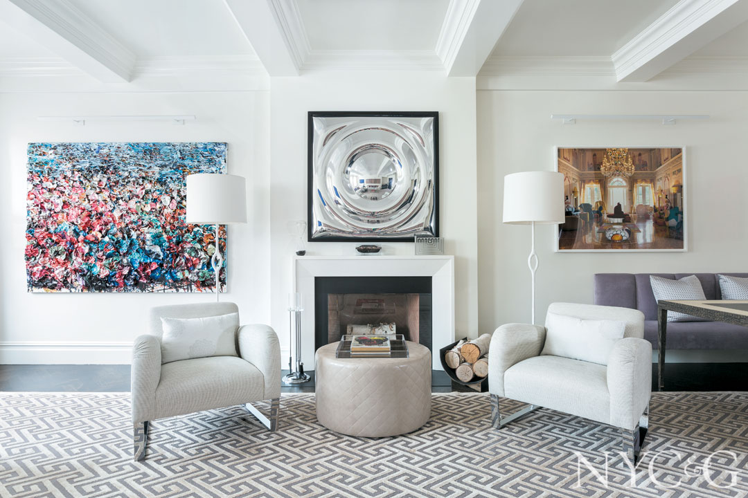 In the living room, Amande floor lamps from Christian Liaigre and Focal chairs from Donghia flank a Metro fireplace mantel from Chesney’s, along with an ink on rice paper work by Zhuang Hong Yi and a photograph by Alberto Narduzzi. The modified Greek-key area rug is from Stark.