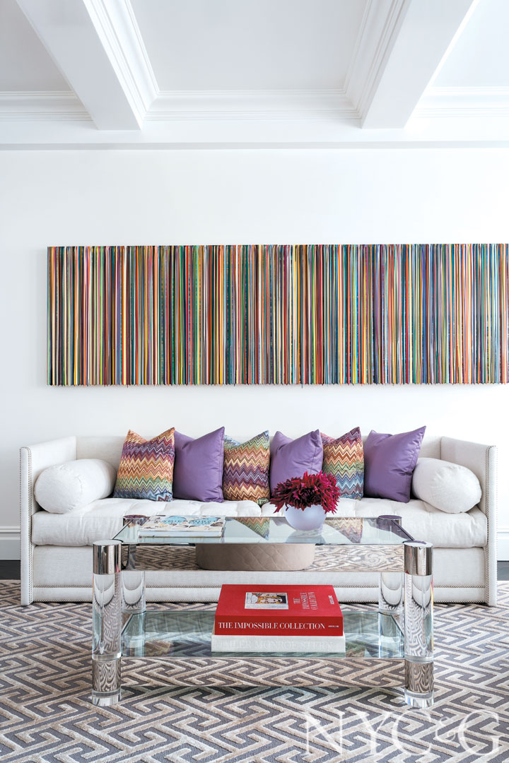 Along an opposing wall, a work by Markus Linnenbrink spans the length of a John Saladino Studded Shelter sofa. The throw pillows are covered in fabrics from Dedar and Stark. The cocktail table is from John Boone.