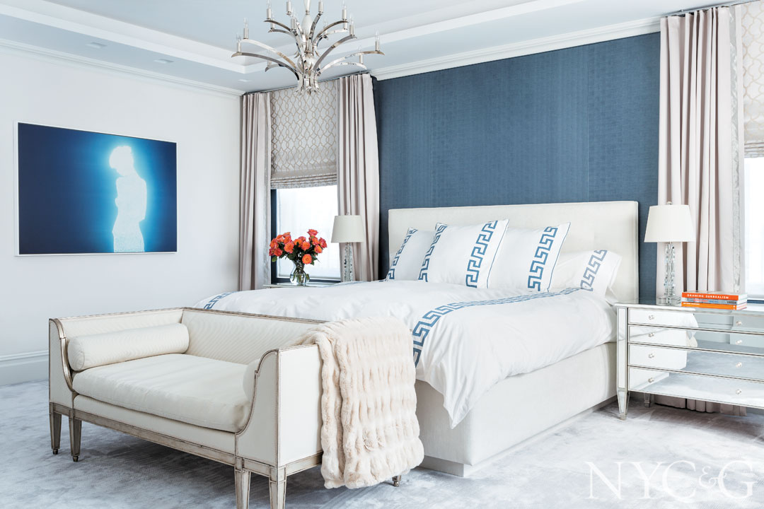 The master bedroom features bedding from Leontine Linens, a Dessin Fournir sofa, and a Mark Figueredo chandelier. A work by Christopher Bucklow hangs on the wall. The draperies and roman shades are made from a Zimmer + Rohde fabric.