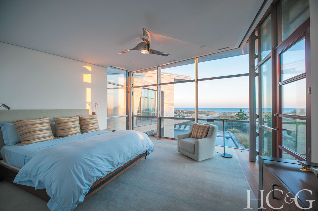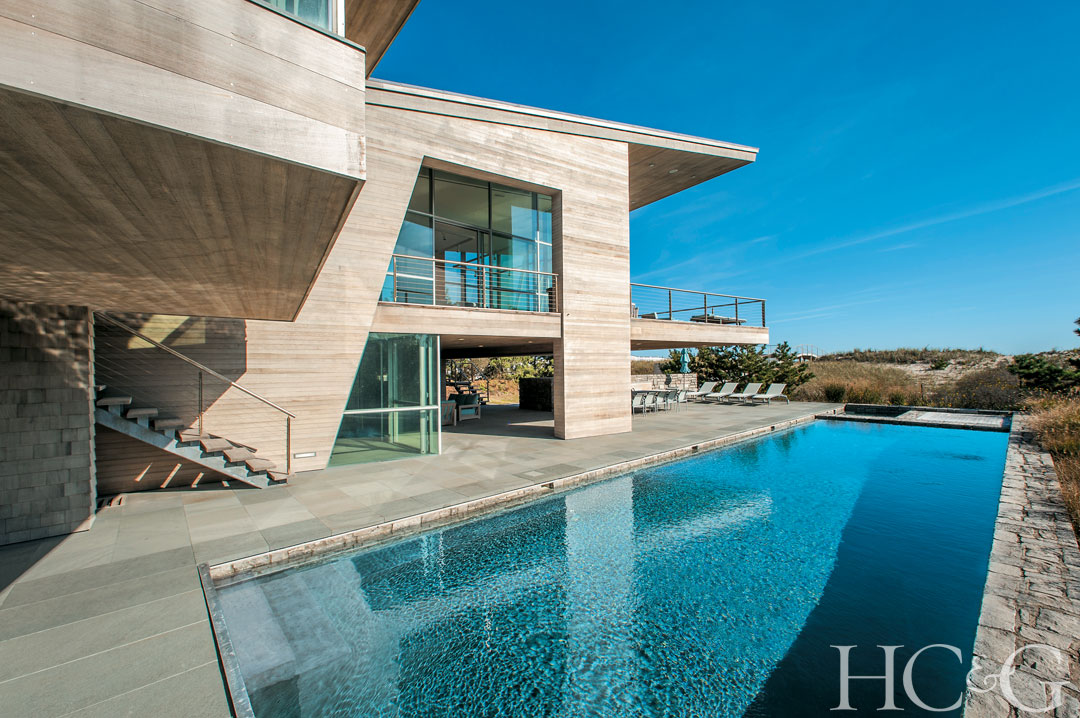 The home’s ocean-facing living room cantilevers above the lower pool deck. The steel exterior is covered in three distinct materials—clear cedar, red cedar, and Pennsylvania wall stone—and features hurricane-resistant windows and railings made from 316 marine-grade stainless steel.