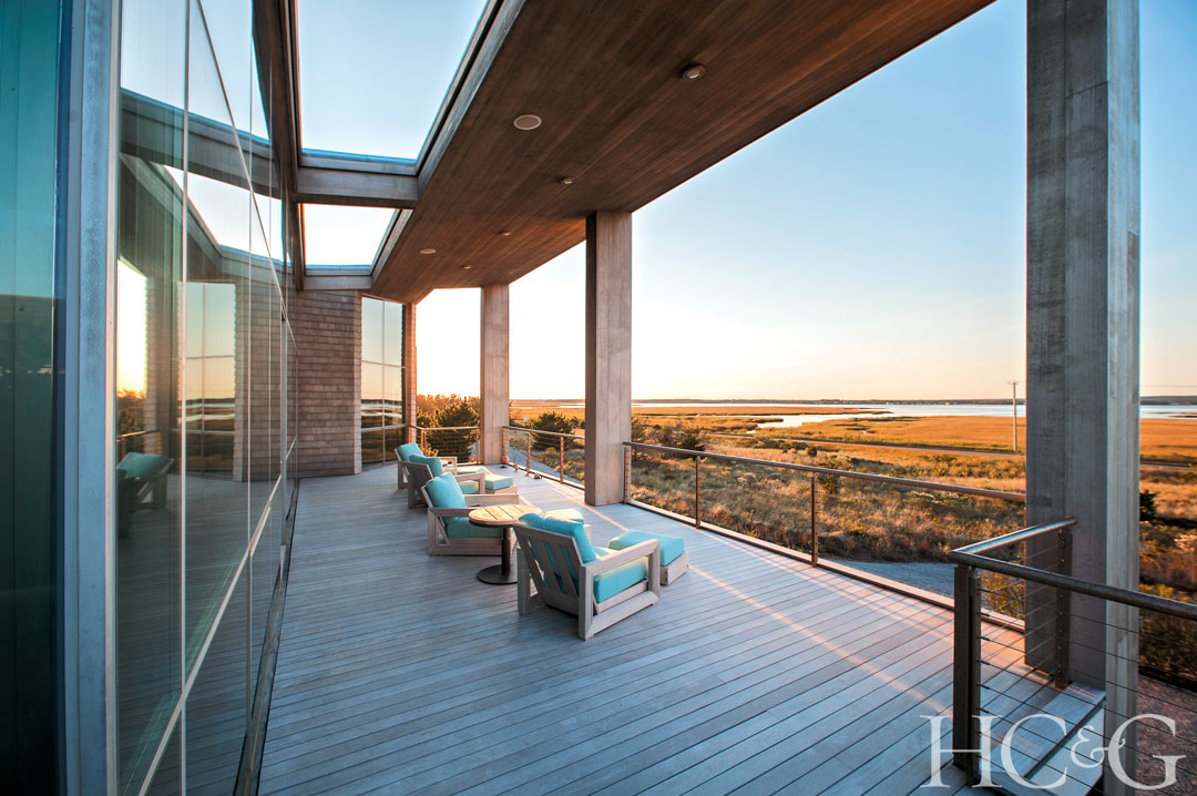 Peninsula chairs and ottomans from Sutherland line a deck overlooking the bay; the blue canvas fabric is from Perennials.