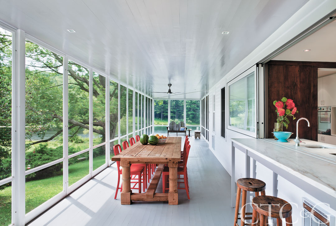 The new screened porch offers a stunning view of the pond. The screen panels by Fitting Millwork Supply can be replaced with glazed panels during the winter. The red dining chairs by Design Within Reach were made from recycled Coca-Cola bottles. A window opens above the countertop for easy access to the kitchen.
