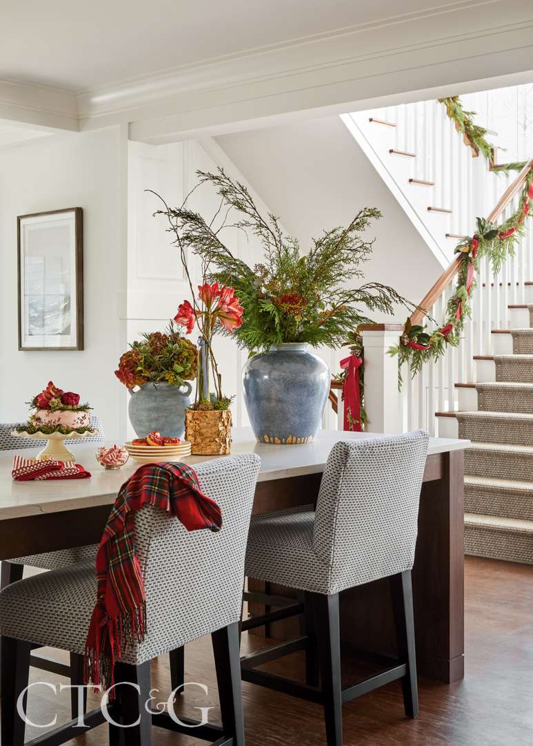 The holiday magic continues in the kitchen. The homeowners host both Christmas Eve and Christmas Day for their large, out-of-town family, so the kitchen is a busy prep and gathering place. Anchoring the room is a walnut- stained island by Sterling Custom Cabinetry. Atop the stone countertop from Academy Marble, ceramic vessels are grouped and filled with evergreen boughs, dried flowers and amaryllis. Flanking the island, a Lee Industries counter stool in Fabricut’s Meher fabric gets a holiday nod with a classic tartan throw.