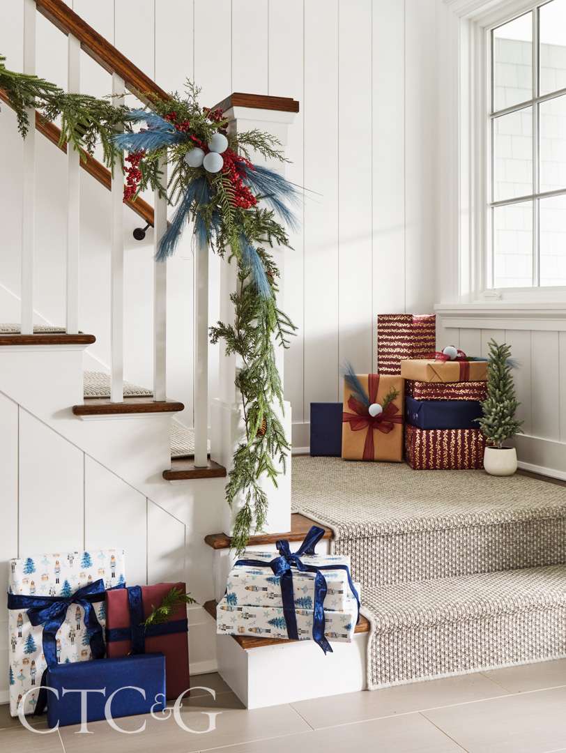 “The back stairwell leading to the mudroom is one of the first areas you see when entering from the garage,” says Leonard. “So we felt it deserved some holiday cheer.” She draped the banister with garlands of greenery, powder-blue pampas grass and winter berries. Parcels in SB Paperie’s gift wrap await delivery.