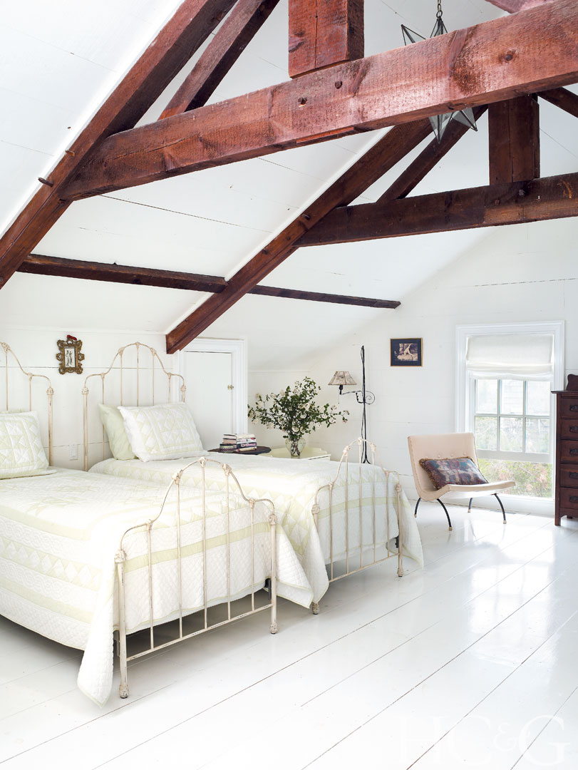 A guest bedroom on the attic level was once Sherman’s studio and has since been converted into a restful retreat.