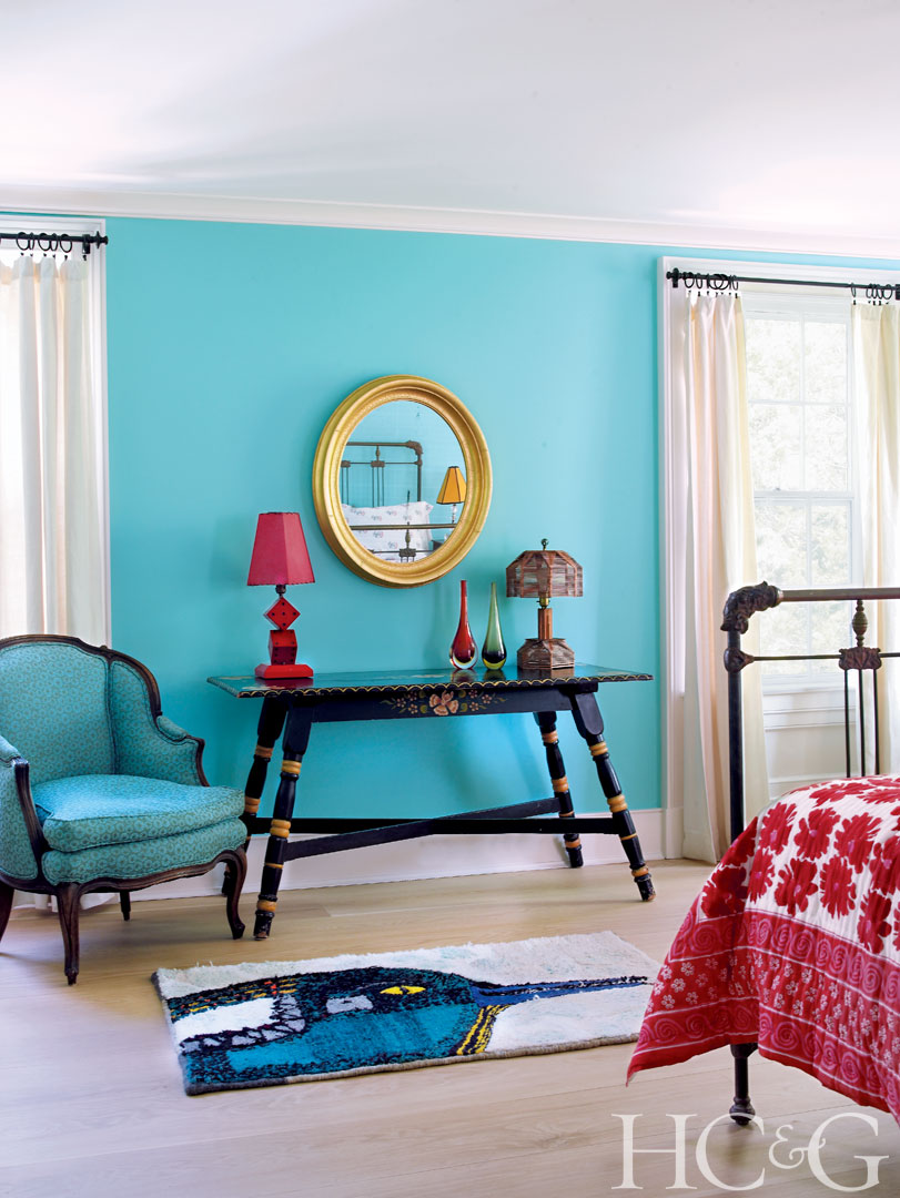 Turquoise, persimmon, and red make a powerful palette in a guest bedroom.