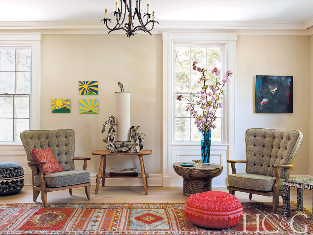 Much of the art on Sherman’s walls is the work of friends or yard-sale finds. In the living room, a trio of collages by Margaret Lee adds bright contrast to a painting by Rima Mardoyan; the poufs are from Future Perfect.