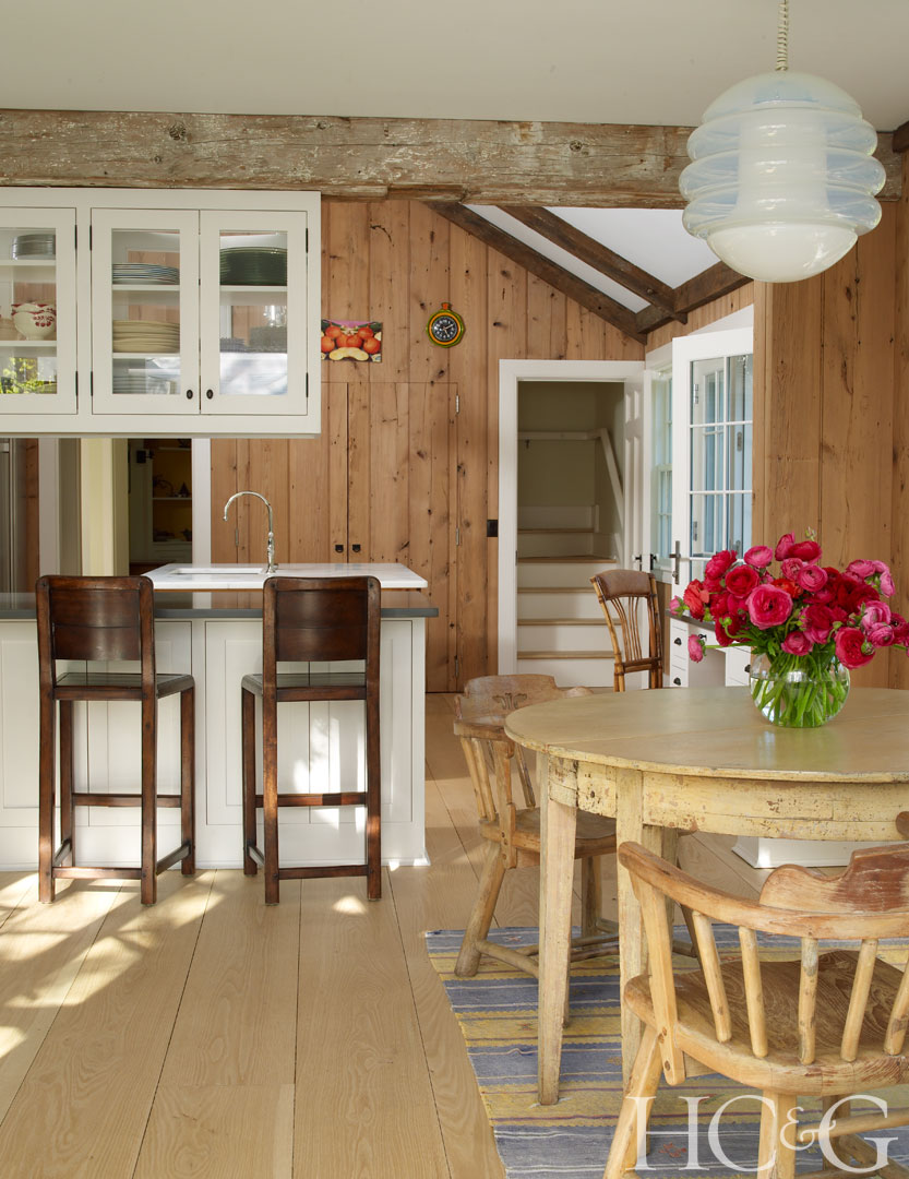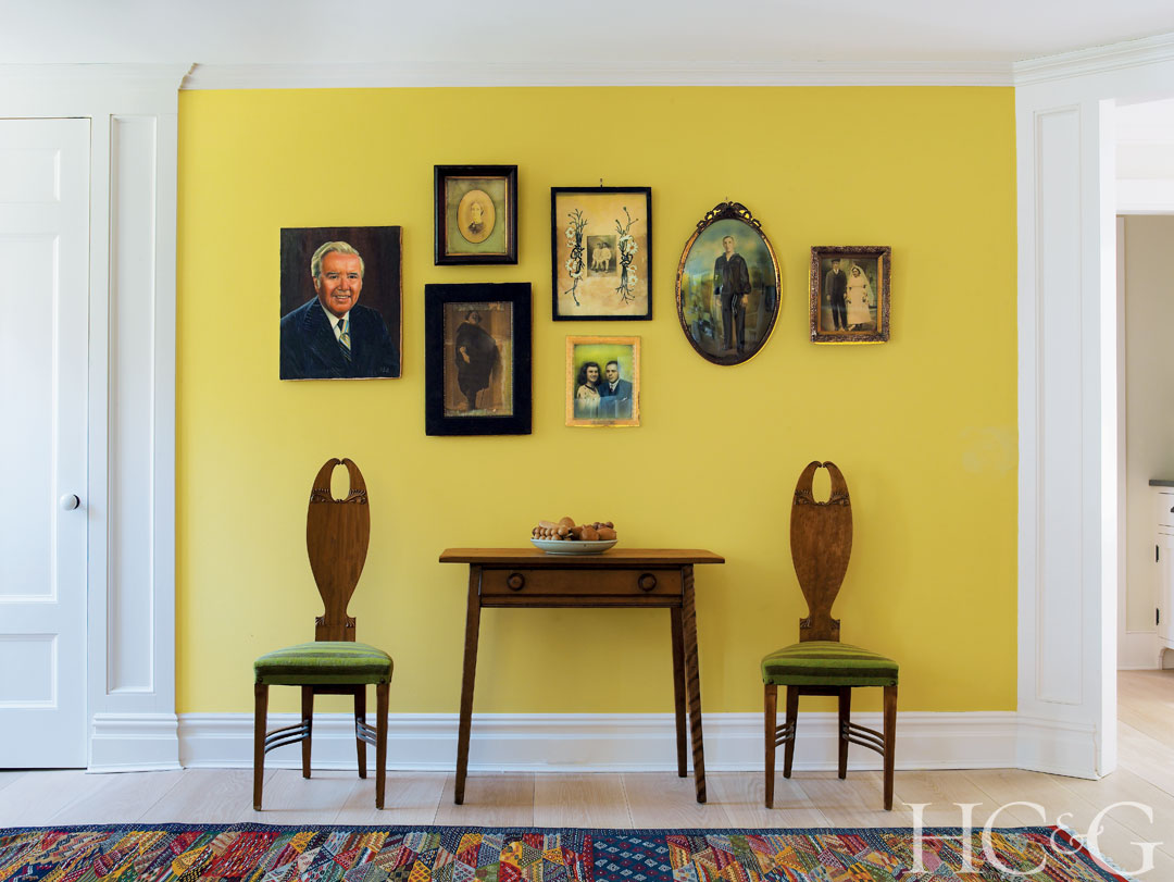 A butter yellow color palate in the dining room compliments an arrangement of vintage photographs, which hang above a rustic table and two delicate side chairs.