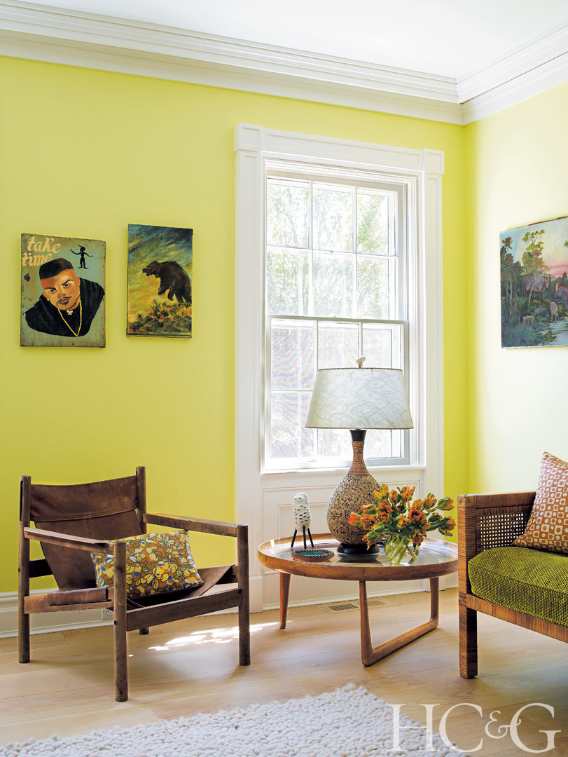 Sherman has experimented with vibrant colors throughout the house, such as chartreuse in the sitting room.