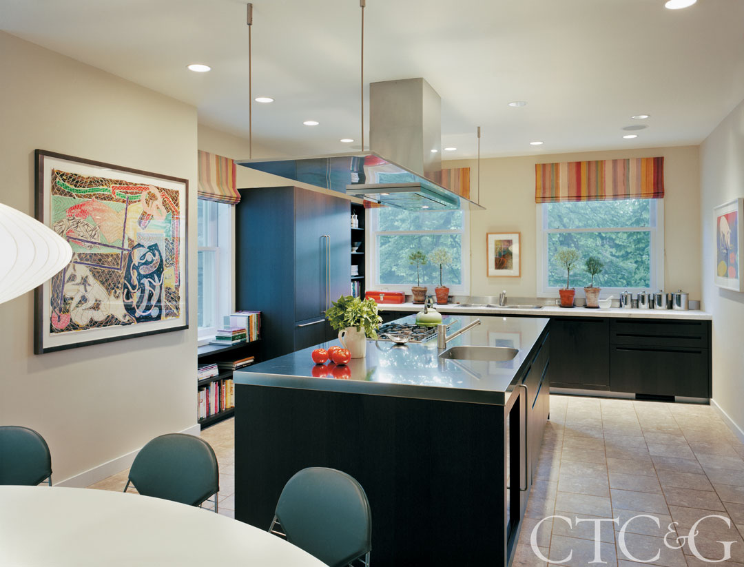 An expanded and modern kitchen features dark walnut cabinets, a limestone floor and a large island under a custom-designed hood from Boffi.