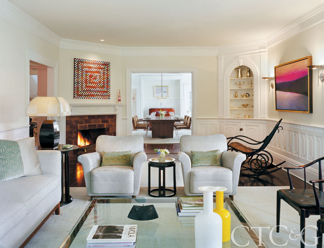 In the living room, the rocker is an antique purchased in Chicago, and the two club chairs are 1930s French Art Deco from George Champion of nearby Woodbury. The rug is a Warp & Weft custom design.