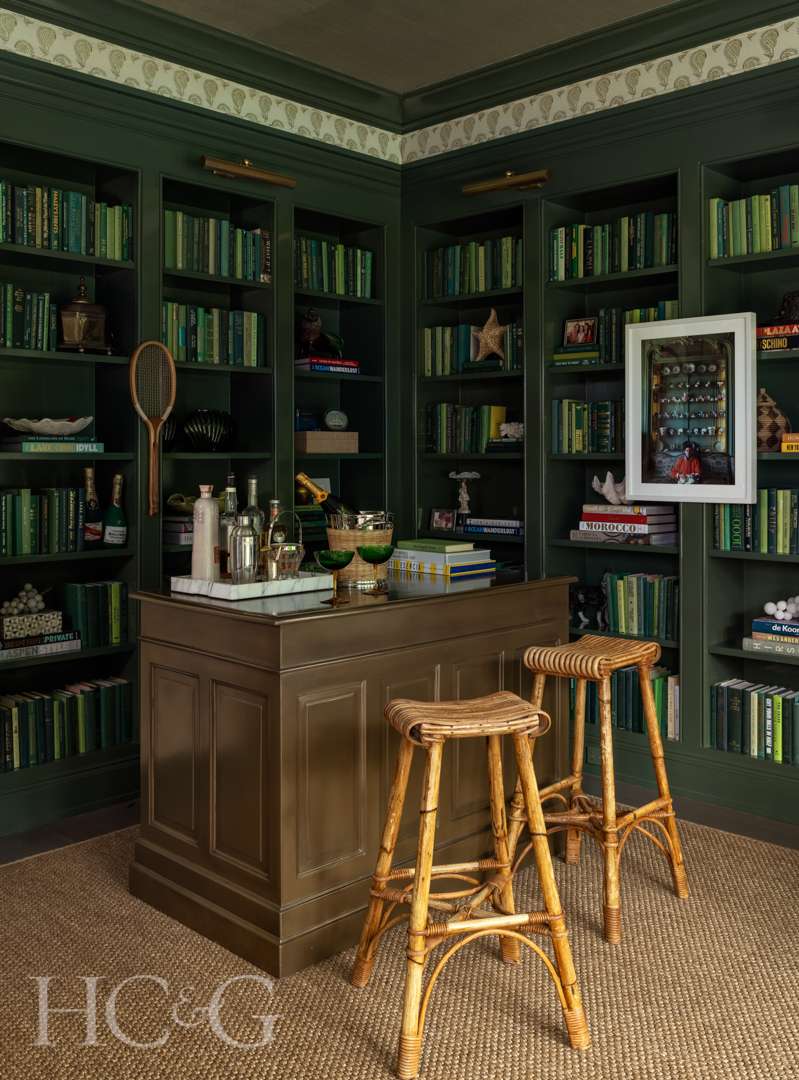 The hue not only references a pickleball court, but also the expansive lawn on which the Shingle-style house sits. “We played with the idea of visually extending the lawn, melding the inside of the house with its outside,” says Winston, “plus there’s the green of hedges, a common feature you associate with the Hamptons.” The design duo even filled the bookshelves with all green books. “The room is so gorgeous and super cozy,” adds the homeowner.