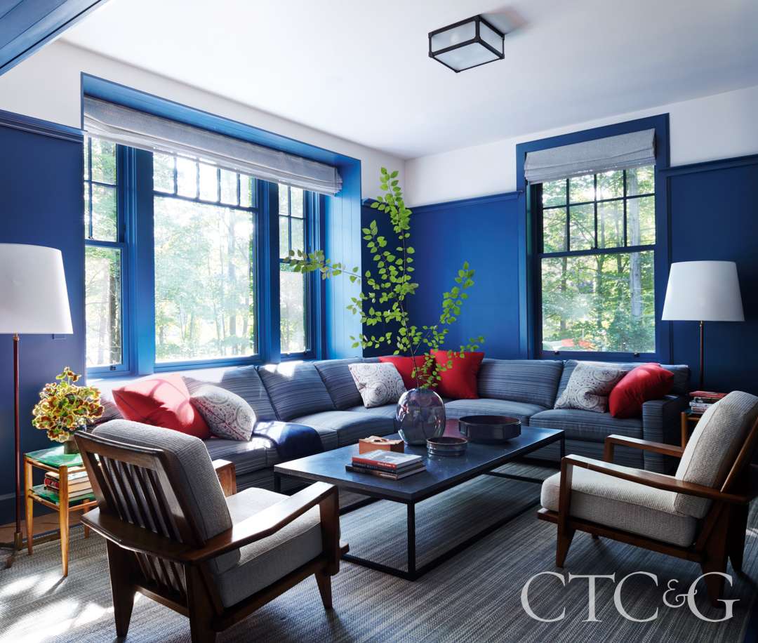 The clients are real bibliophiles, so we decided to make the entrance hall a proper library for their incredible collection, with floor-to-ceiling bookshelves and expansive windows with views out to the lake. Tom had the wonderful idea to make the corridor curved, which adds to the sense of discovery and surprise. As for the aesthetic direction and interior appointments, we’d already done two other projects for these clients, so we had a basic sense of what they respond to. But they weren’t interested in a rehash of their homes in Manhattan and Florida. The New York apartment feels more modern and, appropriately, a bit more formal. Their home in Florida is located in a contemporary high-rise above the ocean, so that one is even cleaner and more severe. Here, they wanted to lean into color and woodsy country comfort.