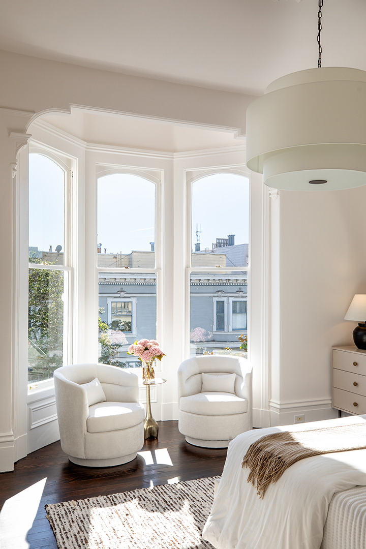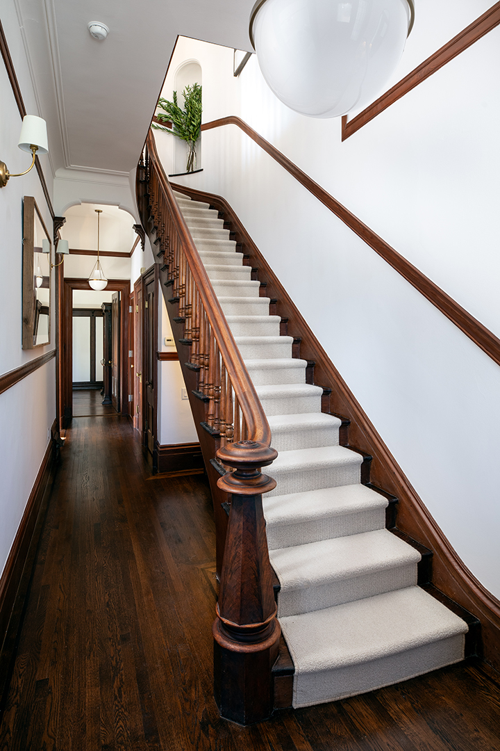 The exterior is painted an elegant butter-yellow and classically ornate with its towers and gables, while the interiors display refined, contemporary-chic style that paints a picture for modern living. White walls contrast with the rich, original wood flooring and moldings. Other historic delights include the fireplaces and arches throughout the house. The listing agent, David Cohen of City Real Estate, recently told Home.com, “We kept the integrity, we kept the charm, the details, but made it more palatable for a lot of the buyers of today,” adding that many “want a more neutral palette.”