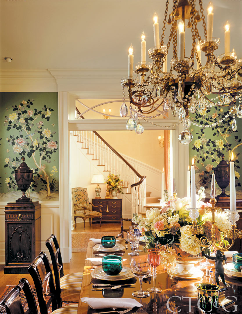 In the formal dining room, notable elements include custom wallpaper from Gracie, a period Regency chandelier through Florian Papp, and Georgian mahogany plinths, circa 1780, each topped with 19th-century knife-box urns.