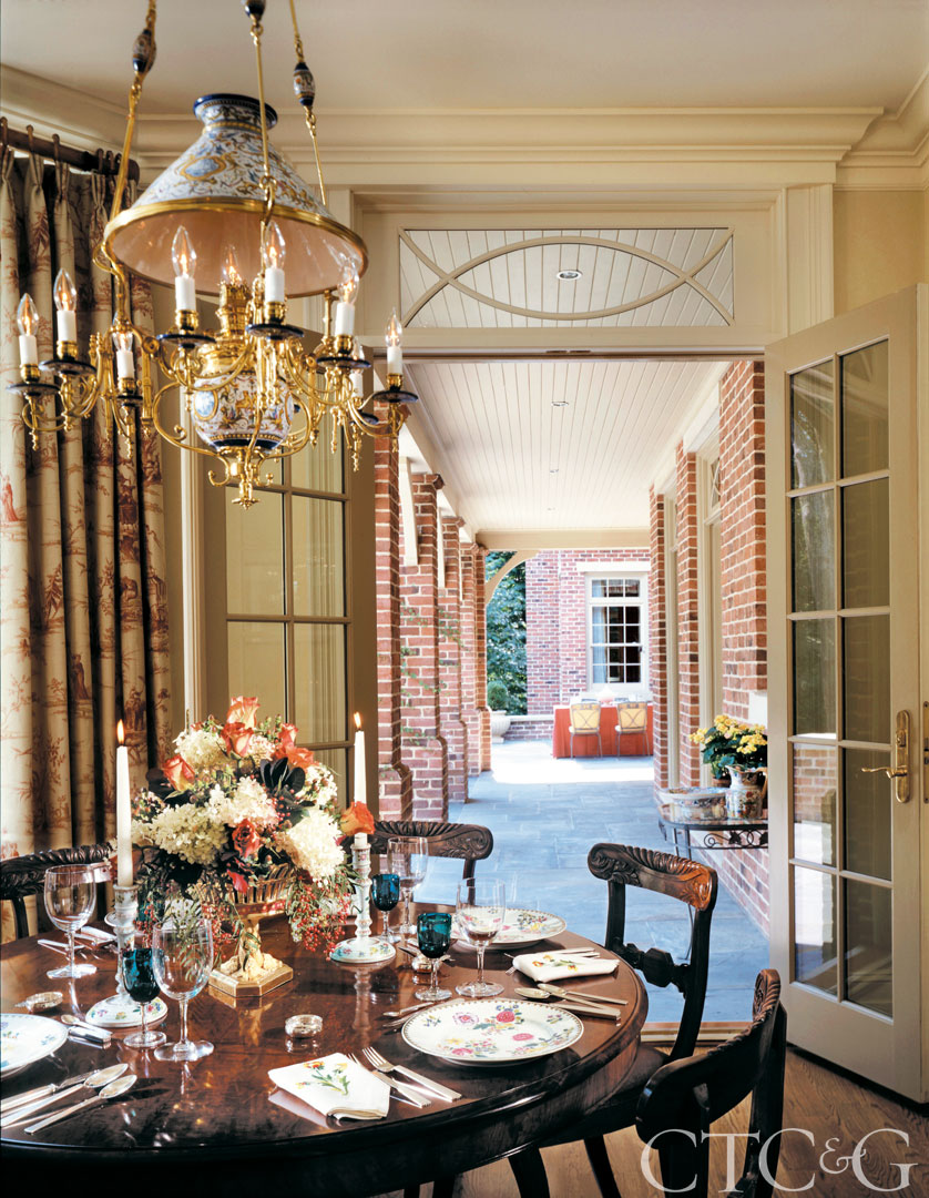The breakfast room has immediate access to a long loggia. The circular Regency dining table is topped with a French chandelier that features a faience-like shade. Drapery fabric is from Old World Weavers.