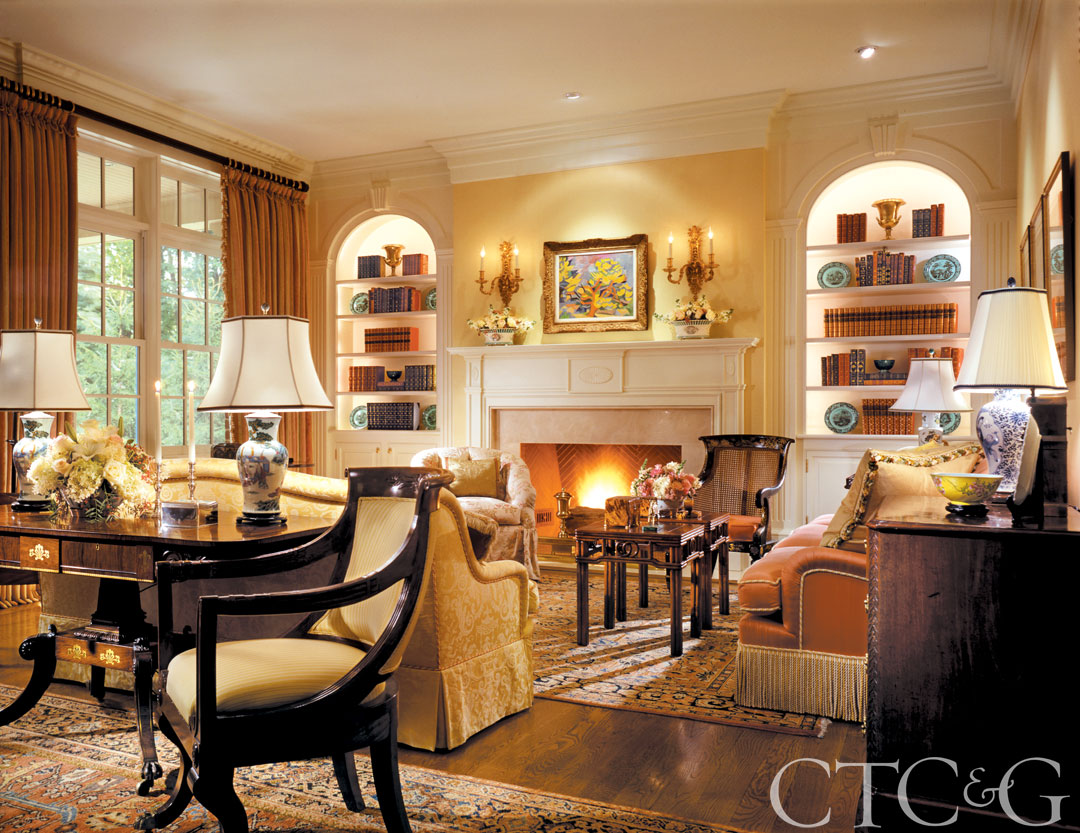 A cozy sitting nook in the family room includes floor-to-ceiling draperies from Old World Weavers that incorporate custom faux bamboo hardware.
