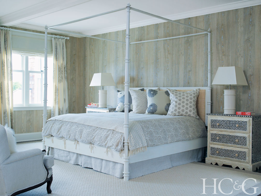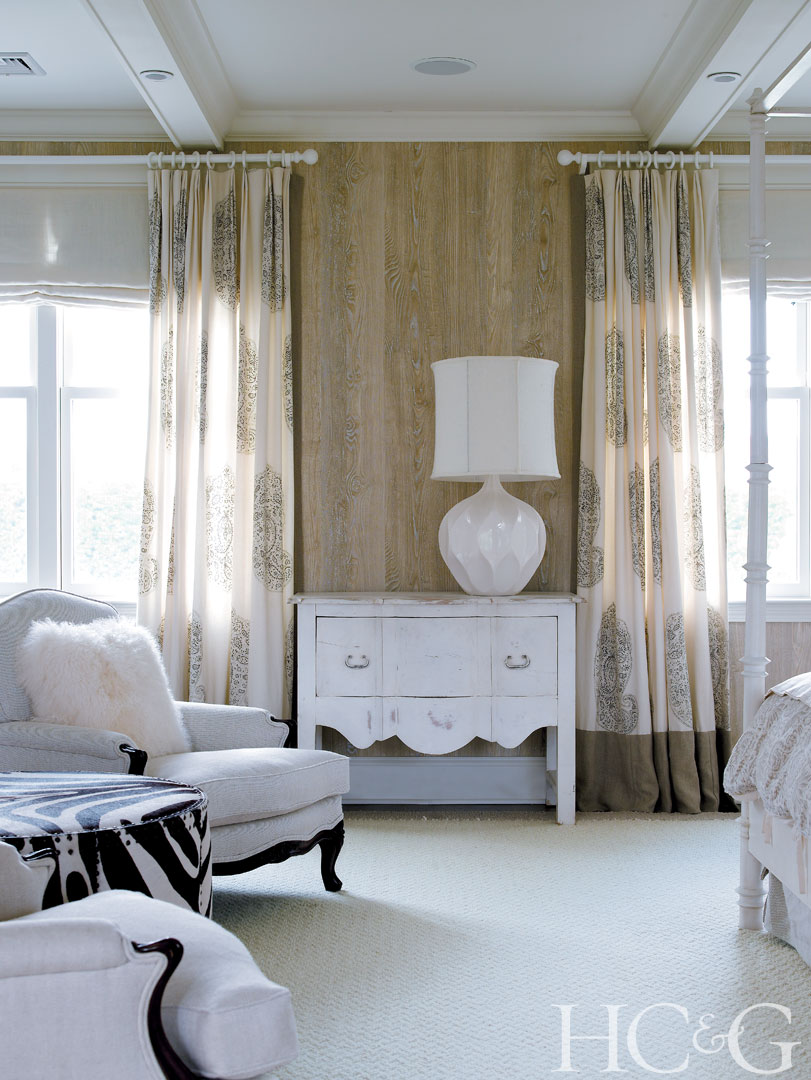 In the serene master suite, bedside tables with inlaid bone from English Country Antiques and an Oly Studio bed lend subtle texture.