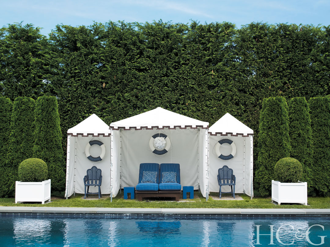 Cabanas from the Awning Company provide a shady retreat. Vintage lifesavers from Hamptons Antiques Galleries and a double chaise from Walters Wicker add to the relaxed ambiance.