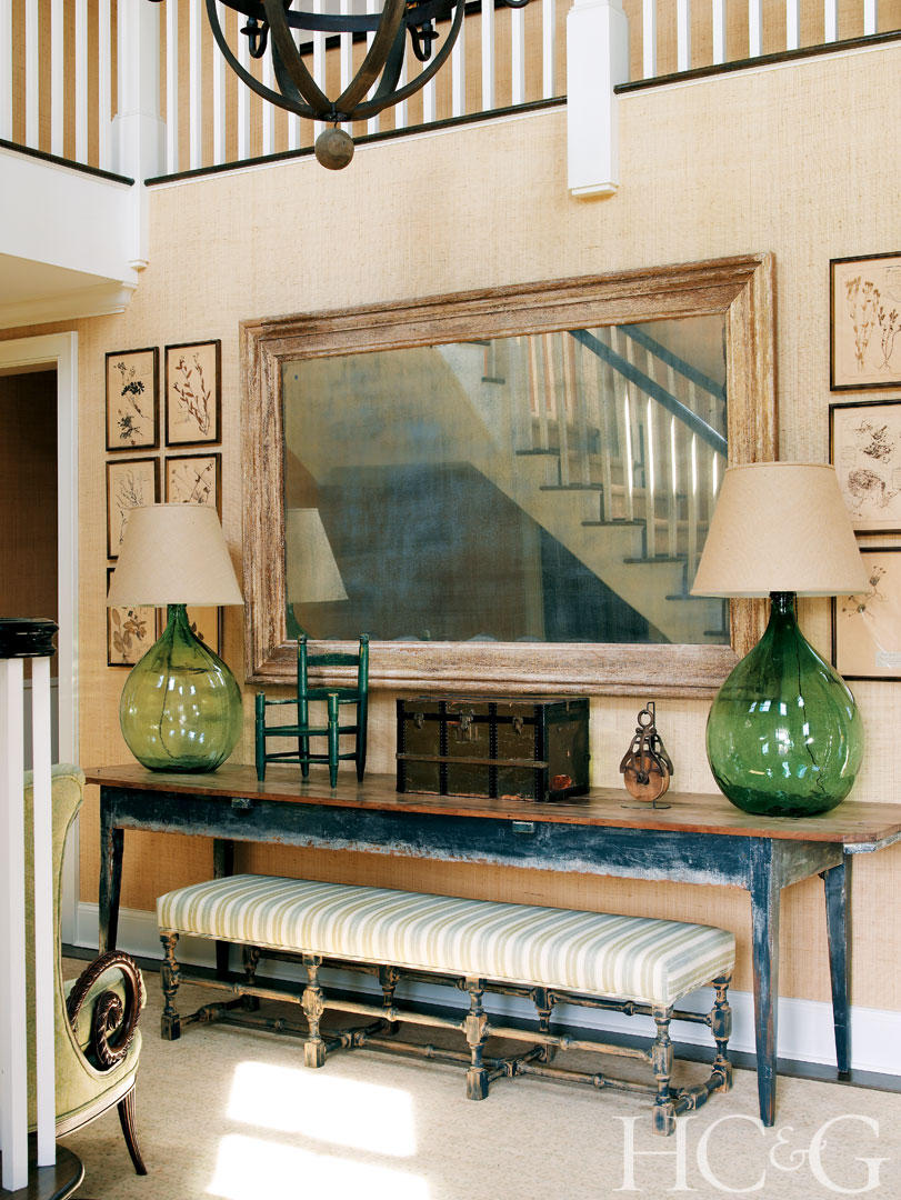 Two converted wine-jug lamps and an antique mirror, all from Laurin Copen Antiques, add shimmer to the foyer; the bench is from Mecox Gardens.