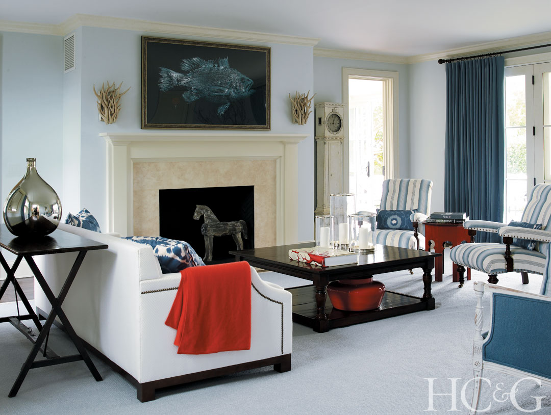 In the living room, a sofa upholstered in a Ralph Lauren fabric sports a red throw from H. Groome, and a Mecox Gardens side table sits between striped library chairs from English Country Antiques.