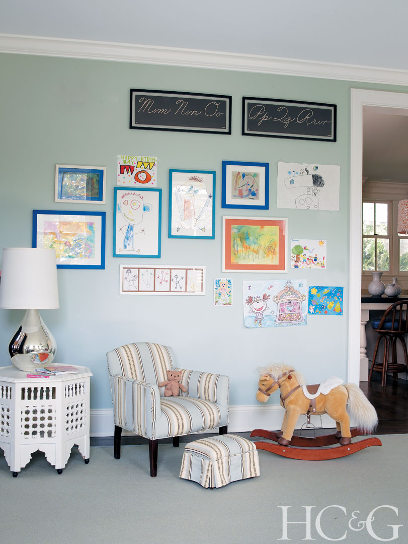 In the playroom, children’s artwork is displayed above a kid-sized chair and ottoman from Hamptons Antique Galleries.