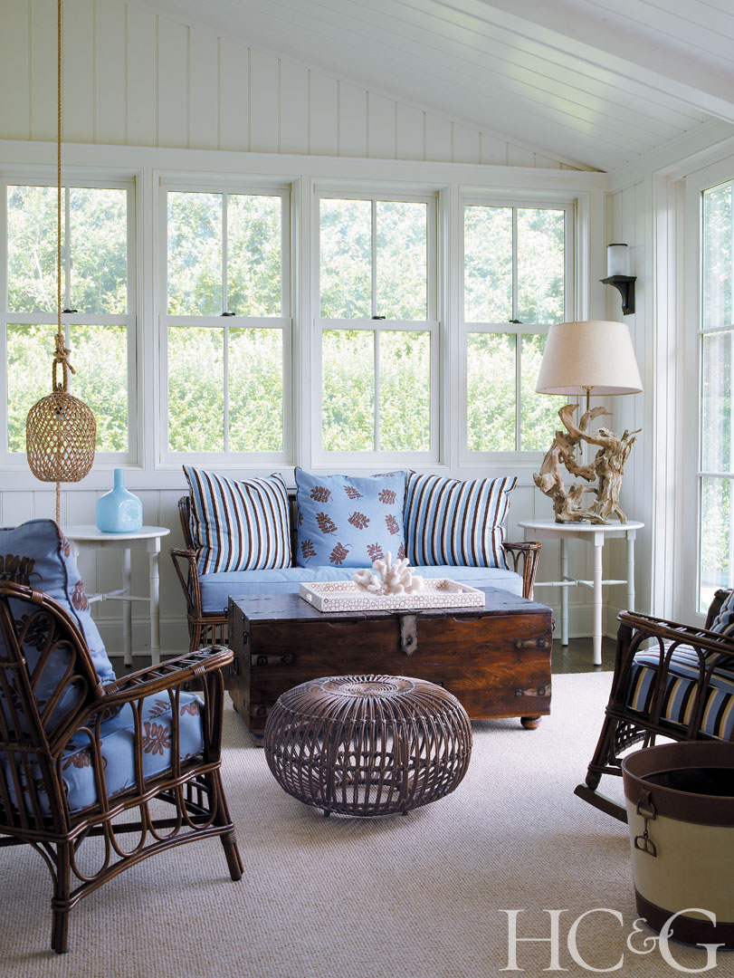 The sunroom features a driftwood lamp from Homenature and antique reed furniture from the American Wing. The rope lantern is from Pottery Barn.