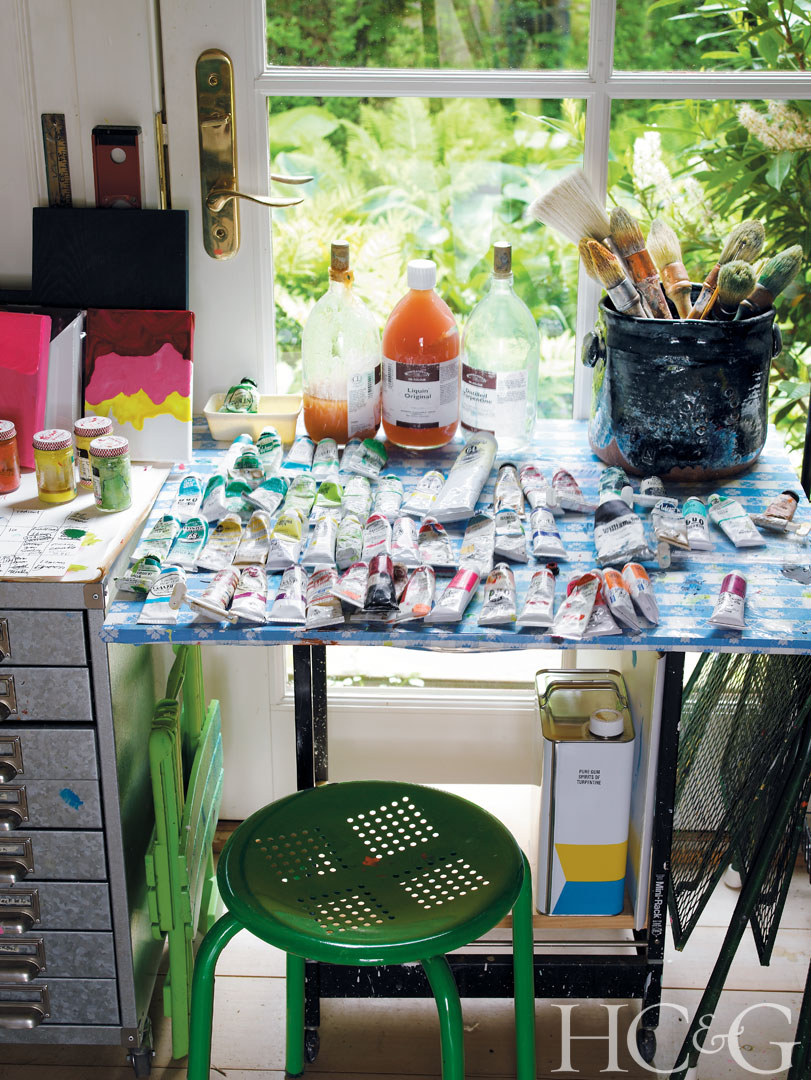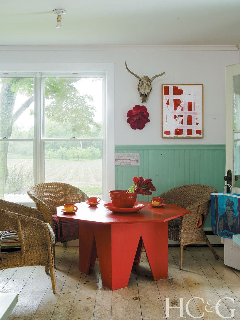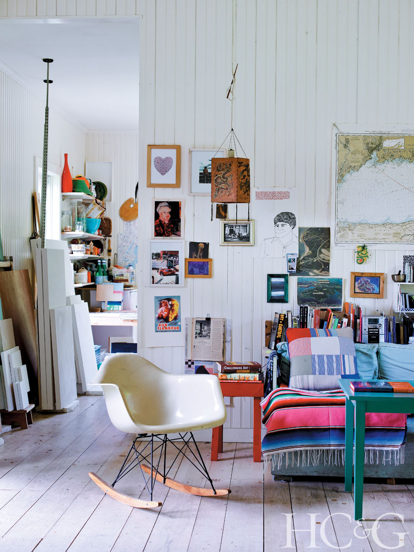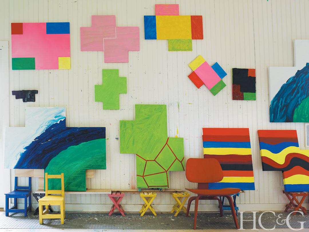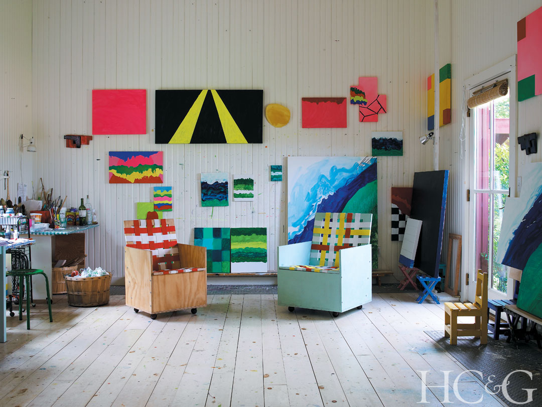Heilmann paints and makes furniture, such as these wooden club chairs with vinyl webbing, in the barn/studio, which was designed by architect Lisa Zaloga and built by Chris Kyprianou.