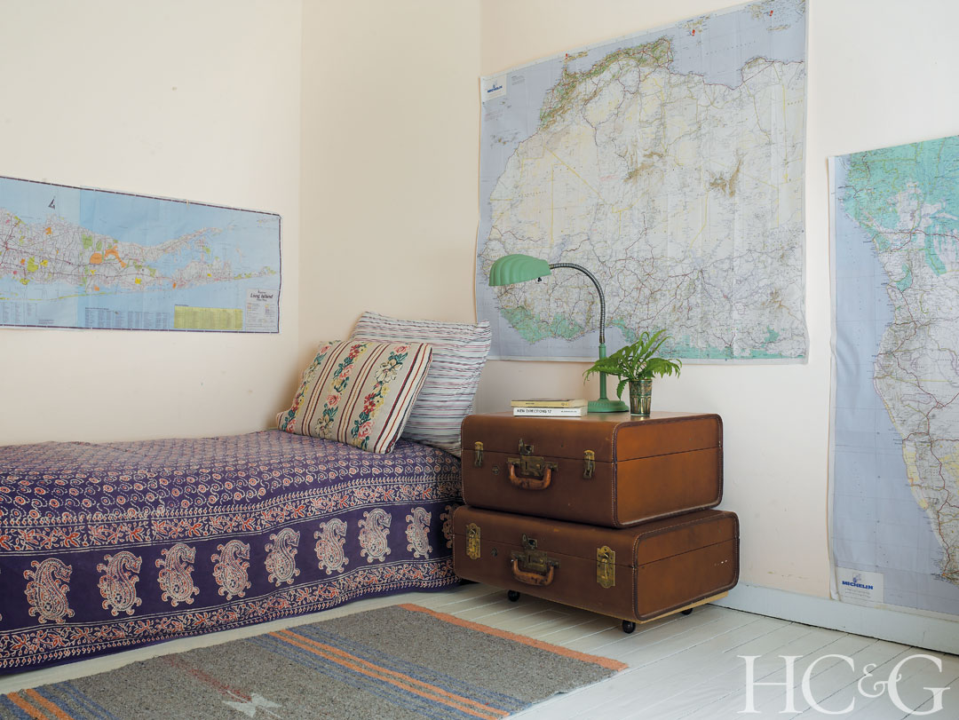 Vintage luggage doubles as a night table in a guest room