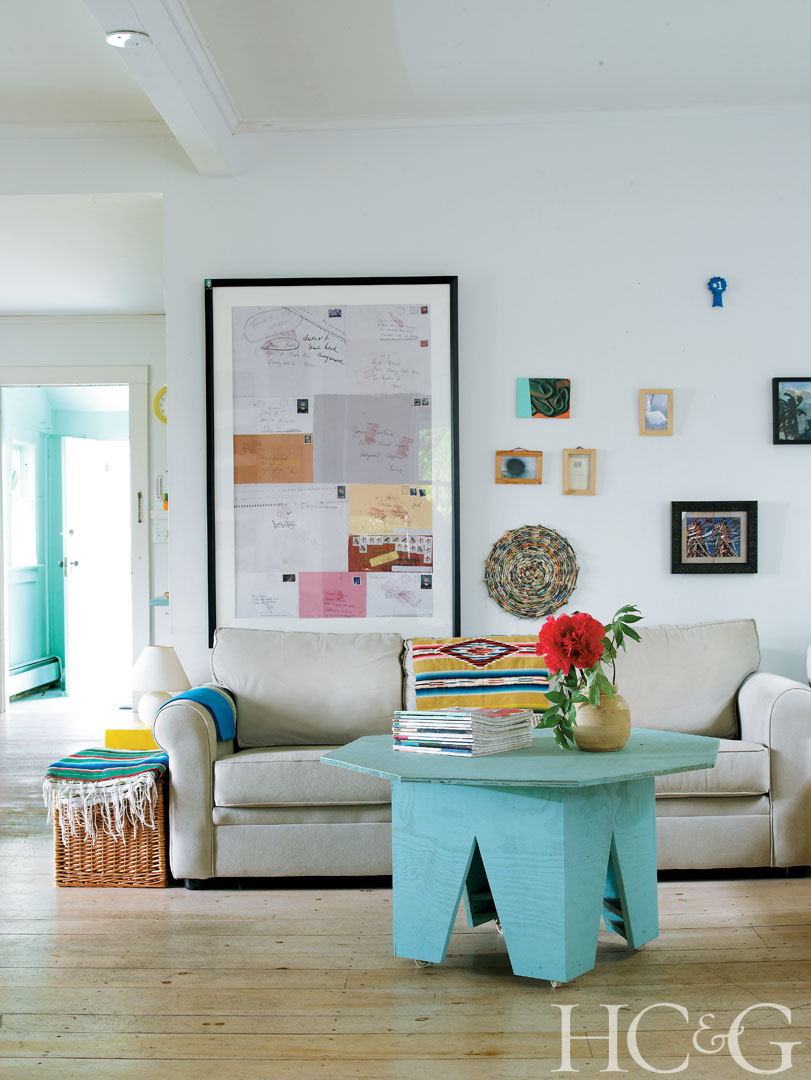 Works by friends including Dianne Blell and Christopher Knowles hang on an opposing wall, loosely arranged above a serape-covered sofa and an Eames rocker.