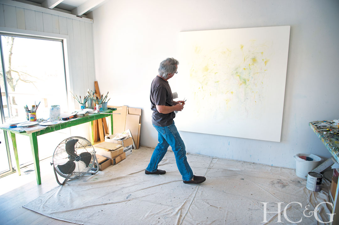 Harm often pushes furniture aside to work on large-scale canvases.