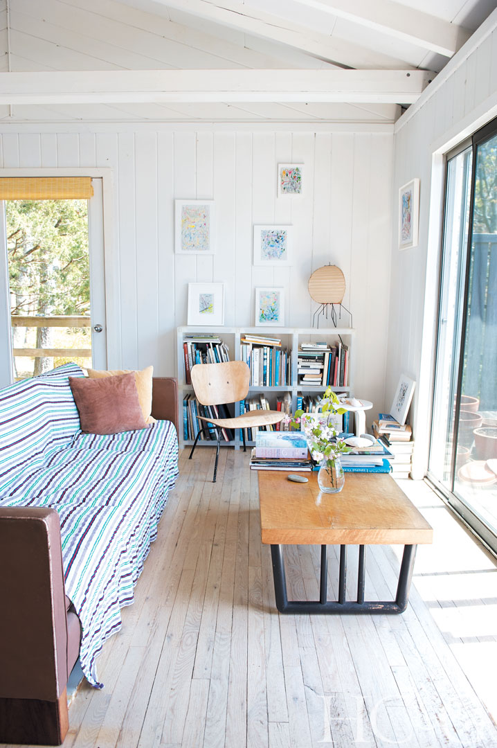 The living room’s leather sofa is covered in a striped throw from Steven Alan. The coffee table is from Homenature; an Eames chair and Alvar Aalto table sit behind it.