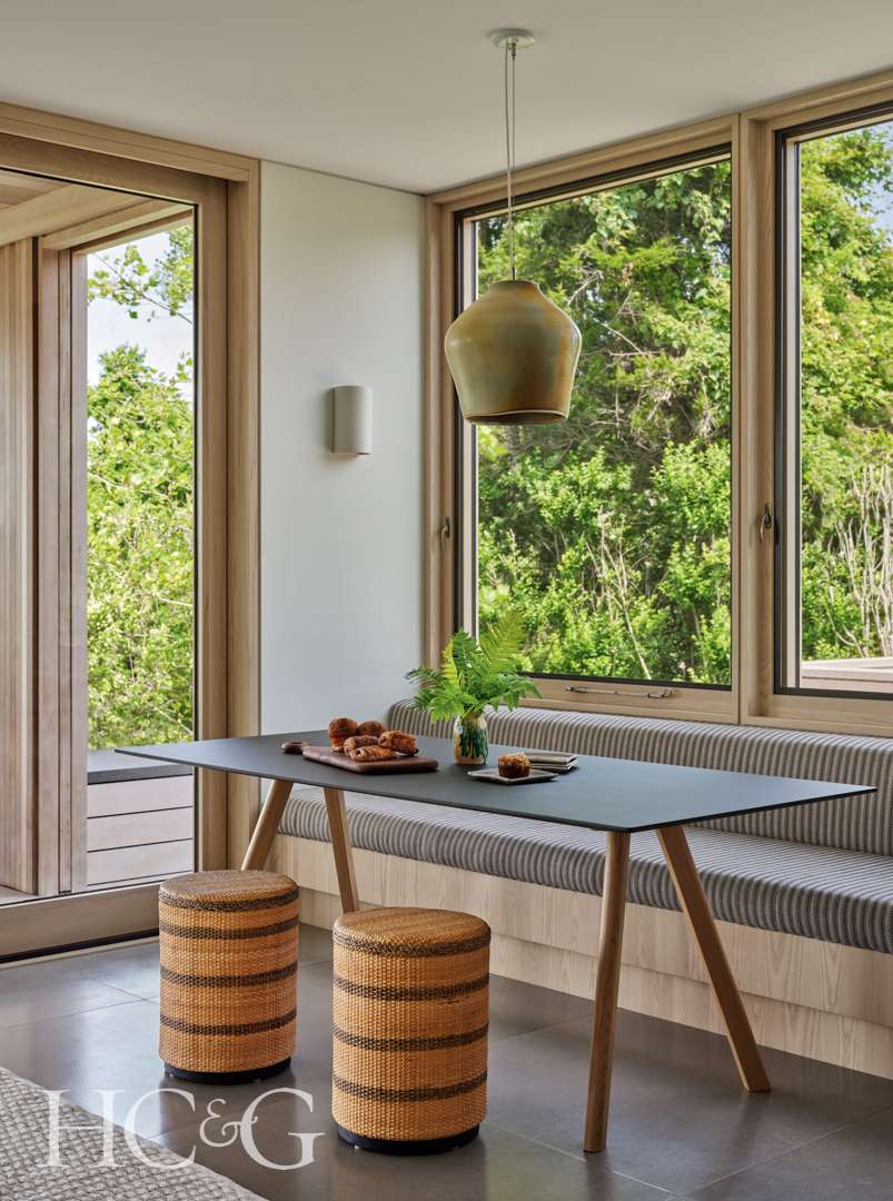 The clients commissioned May, a fellow Jamaican with whom they had worked on their home in Jamaica, to configure the interiors. “What I love about this house,” says May, “is the rectilinear qualities that the architects were so keen on.” But to soften those sometimes hard effects and to present a corollary to the right angles, May chose curvaceous sofas and coffee tables, rounded ottomans and lighting fixtures that assume sculptural forms. Wood-fired porcelain pendants hang over the kitchen island, which were sculpted, fired, and tinted by her brother David Pinto, a noted Jamaican-based ceramic artist. “The thing about wood firing is that you never know how it will affect the finish, but these came out right,” she emphasizes.