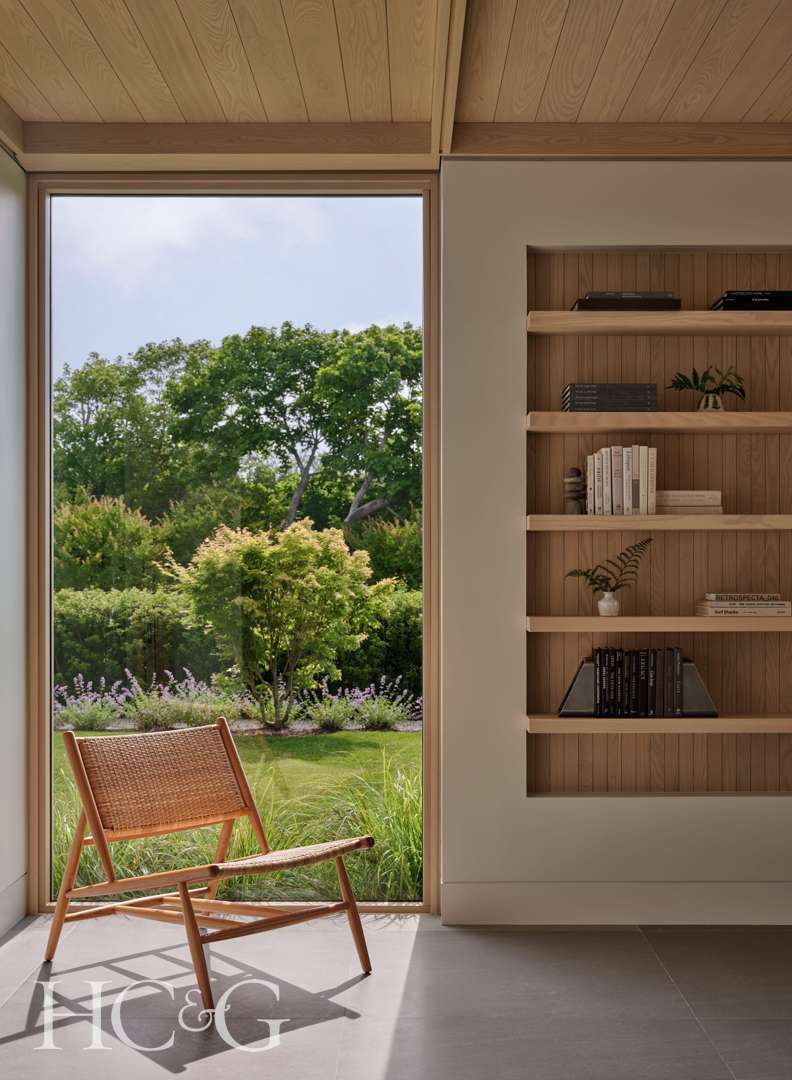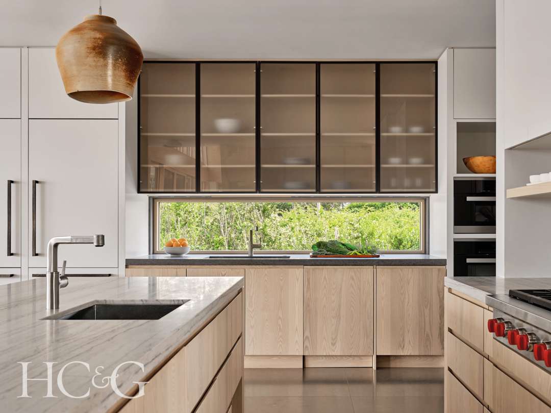 So attuned to effect is the Soule team that they chose ash wood for the interiors. “The clients, who are from Jamaica, wanted cool limestone floors,” Janara explains, and “we thought the ash would provide a better, lighter contrast.” The architects carefully ensured that the very graining of the ash wood would feature “cathedral graining,” whereby raw logs are cut flat to reveal the innate pattern. Meanwhile, all of the ash used in the kitchen as cabinetry and for the island was cut to emphasize a vertical grain. “The effect of the wood in the kitchen is softer to the eyes,” says Janara. A single horizontal pane of glass serves as a backsplash, while frosted-glass cabinets become strong visual moments, while still serving their purpose