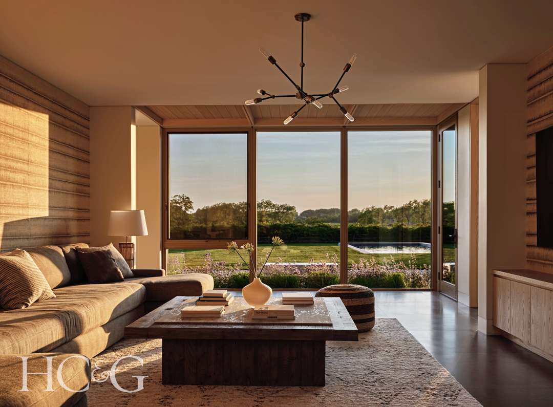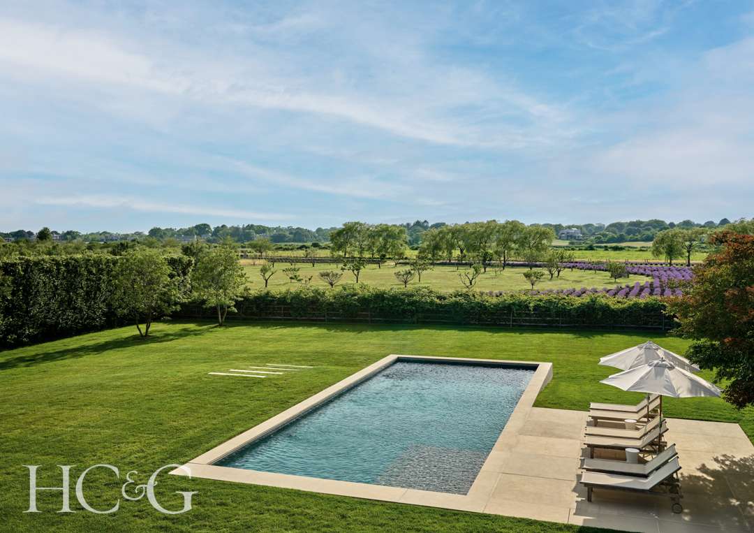 Upon arriving at this Sagaponack house, what comes into view first is what lies behind it. While the two winged, red cedar-clad residence announces itself as a distinctive architectural presence on the land, it’s the fields beyond, dense with fruit and lavender trees, that assume a visual priority, with the plantings backdropped by the shimmer of Sagaponack Pond.
