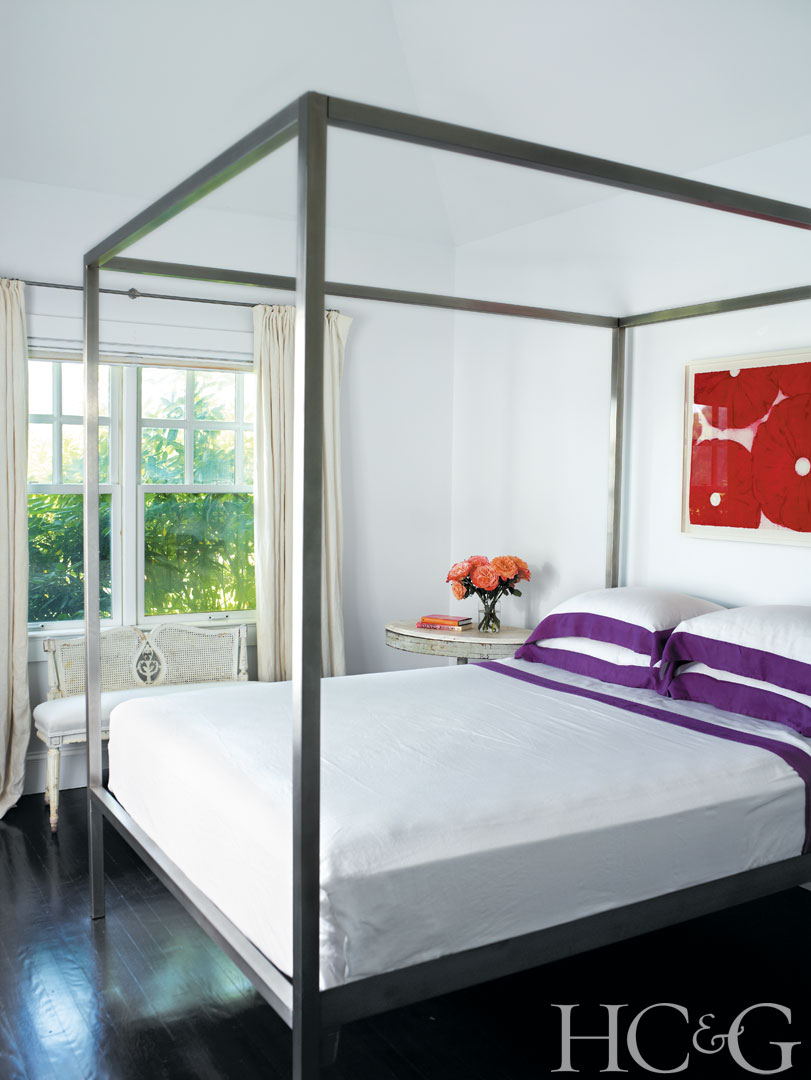Donald Sultan’s Rouge Poppies, in Conté crayon on paper, hangs behind a canopy bed in a guest room. The Palermo collection linens are from Olatz.