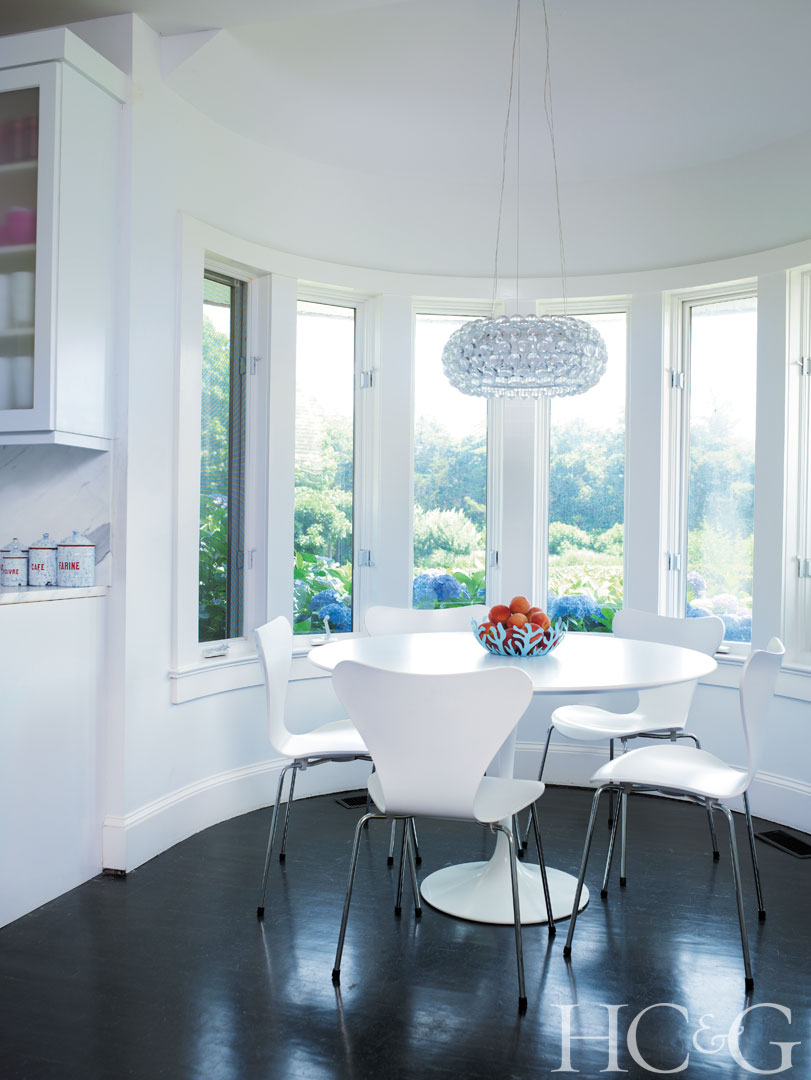 The crisp white dining nook off the kitchen features a Saarinen table surrounded by Arne Jacobsen chairs; the Caboche chandelier is from Ruby Beets.
