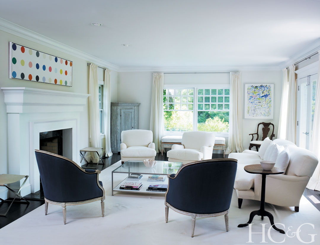Paintings by Damien Hirst and Robert Harms hang in the living room, which includes white upholstered pieces from Ruby Beets and two late-18th-century French bergères, also from Dienst + Dotter. Architect Annabelle Selldorf designed the cocktail table.