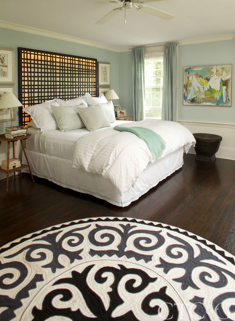 Artisans in Kyrgyzstan made the felt rug in the master bedroom in the age-old tradition of the nomadic Kyrgyz. The headboard, a light screen made from mountain pine and rice paper, is by Tucker Robbins’. The glass lamps are from Simon Pearce.