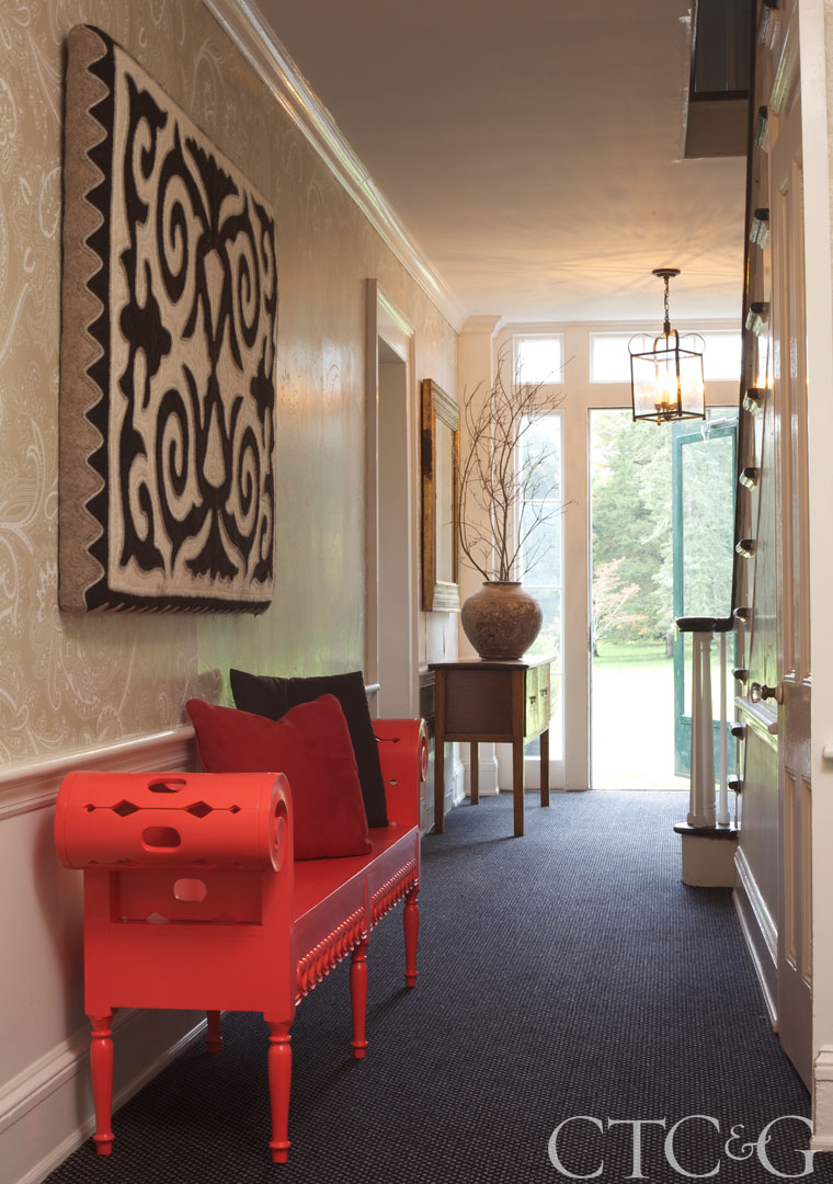 In the front hall, the red Albert bench is from the eponymous furniture line designed and sourced by Tucker Robbins, Miner’s older brother.