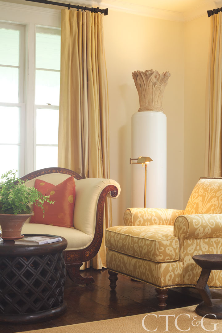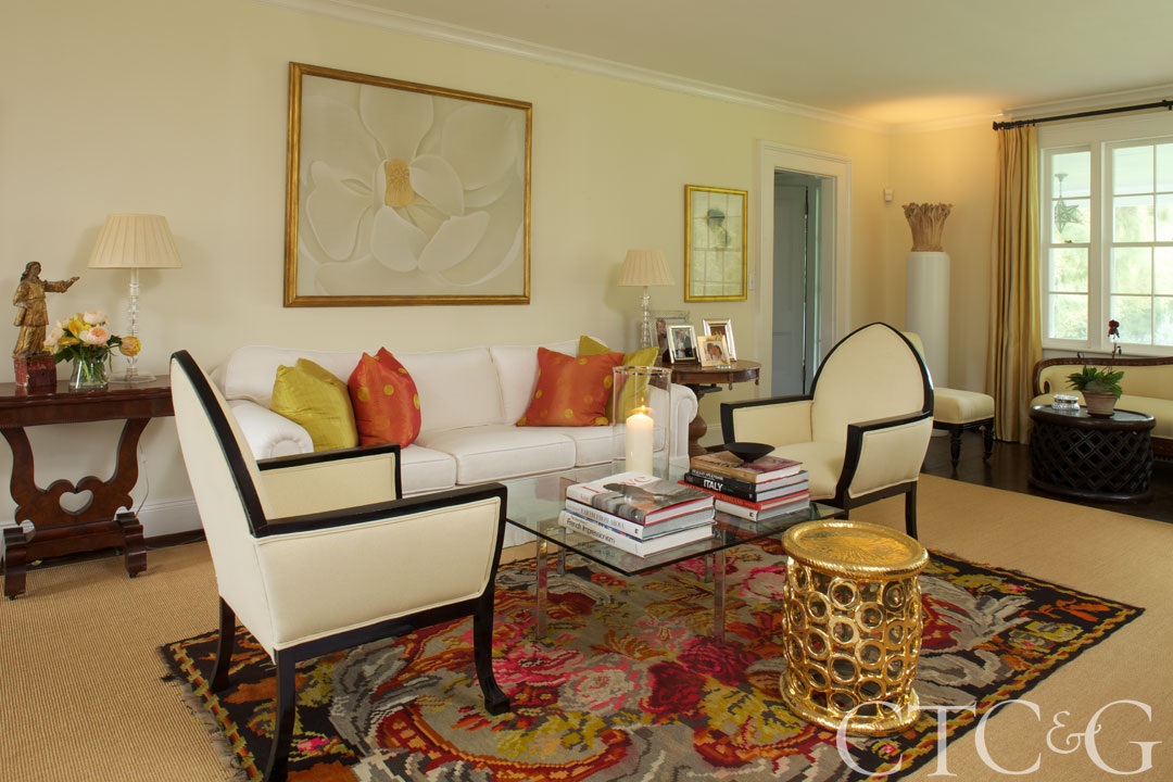 A flower painting by Enid Munroe anchors the living room. Neo-Gothic chairs from Stamford’s Antique and Artisan Center were painted in high gloss black and upholstered in butter linen. Tucker Robbins’ gold porcelain bangle table was made in Peru.