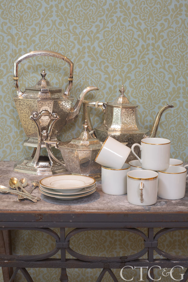 A wedding present to Miner’s grandmother from her parents, the Gorham silver tea set was then passed down to Miner’s parents as a wedding gift.