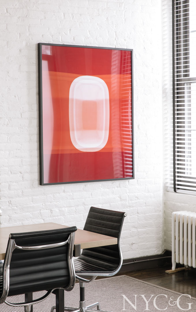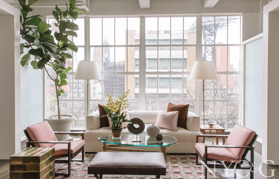 Félix Agostini floor lamps, a Marc du Plantier cocktail table, an antique Swedish rug, and a brass side table from legendary decorator Albert Hadley, Kleinberg’s former boss, fill the reception area, which boasts original factory-style windows.