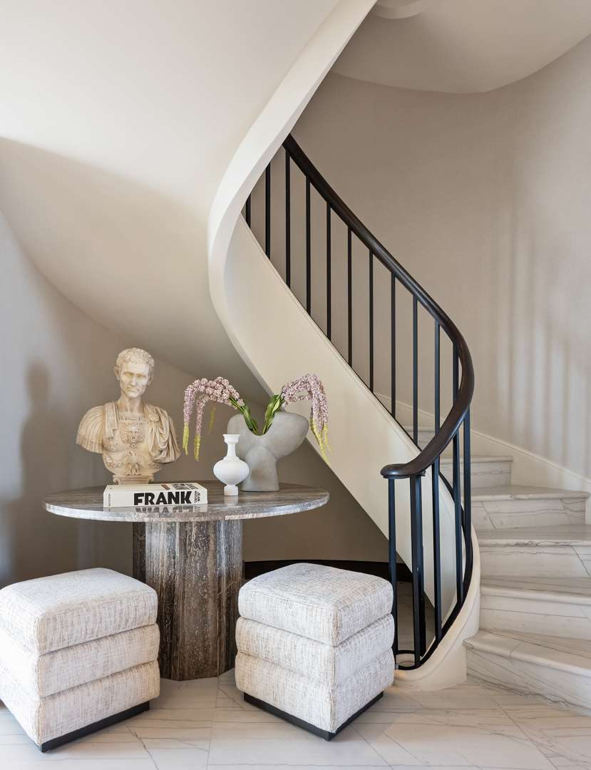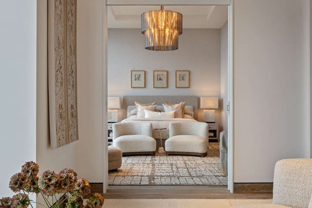 Cheryl Eisen of Interior Marketing Group thoughtfully styled the 6,512-square-foot penthouse with Eichholtz furnishings, Ann Gish bedding, and Arte wallcoverings. In the Met’s third collaboration with Eichholtz, every piece is based on artwork displayed in the iconic museum—allowing iterations of art to seep into everyday life. Chandelier Hibis in the living room mimics floral forms carved in stone. Table Lamp Hathor, which draws from ancient Egyptian artistry, tops bedside tables. Wall Object Acanthus, inspired by a marble pilaster, adorns the walls in the primary sitting room.