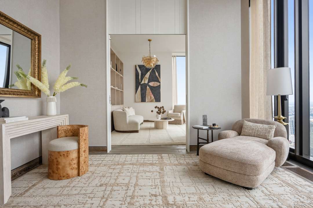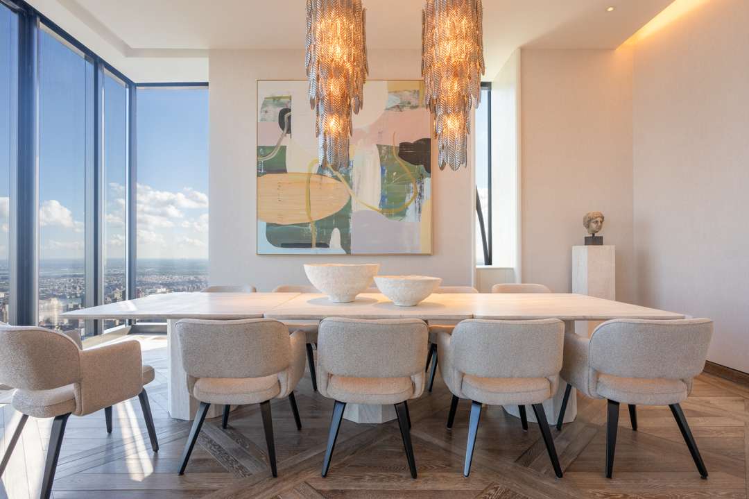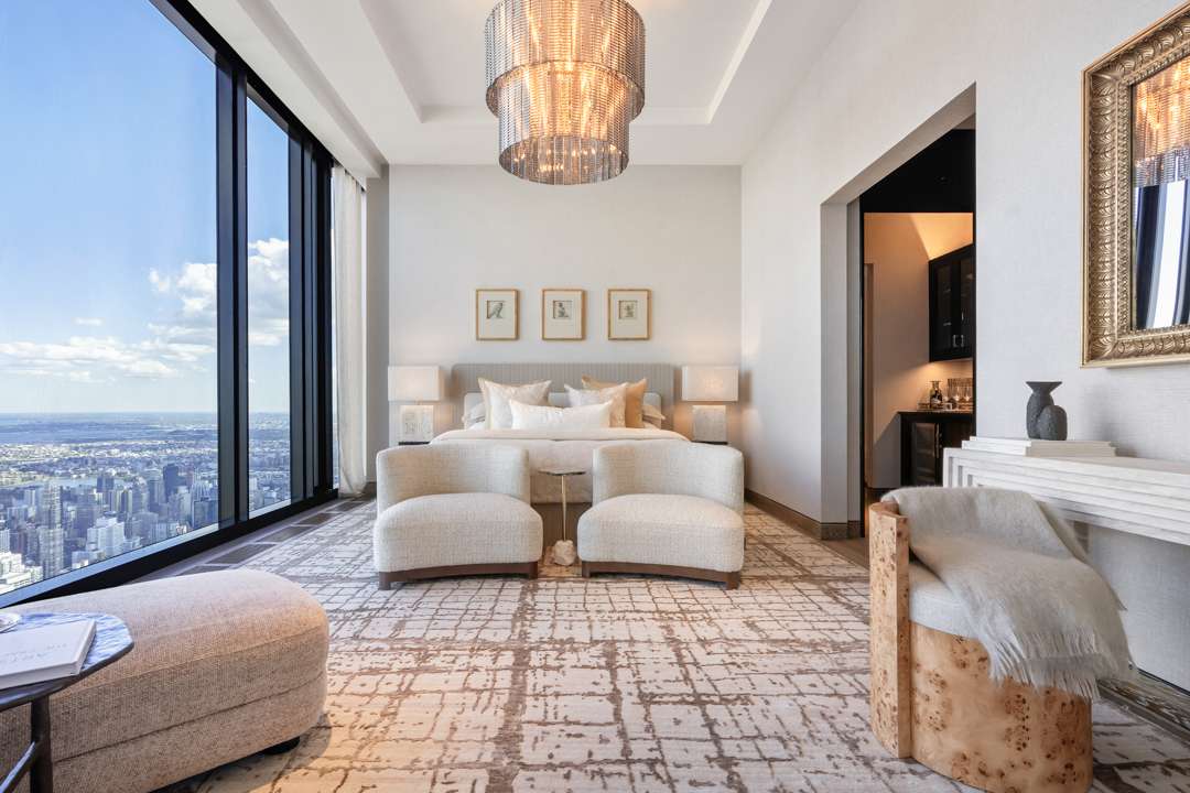 After entering the moody, Art Deco-style lobby, an elevator to the 76th floor takes less than a minute—49.9 seconds, according to my iPhone stopwatch. Upon arriving, it opens directly into the foyer. To the right, a grand living and dining room with views of Central Park and beyond, and to the left, a kitchen and media room—with a private balcony, for the brave, spanning the entire Southern wall. A grand stairway wraps to the second floor, or you can take a different elevator there, where plush bedrooms await. The penthouse is currently set up as a three-bedroom residence with dual bathrooms in the primary suite (with one bathtub set right over Central Park), but may be configured as four bedrooms.
